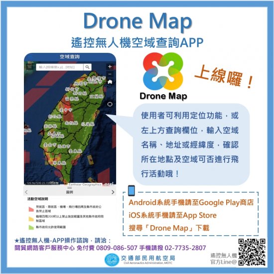 二、民航法遙控無人機專章自109年3月31日施行,民航局已彙整遙控無人機圖資資料,並匯入「遙控無人機管理資訊系統」,另已建置行動裝置應用程式(DroneMap),搭配地理定位功能,可提供無人機操作人知曉遙控無人機活動區域相關規定。