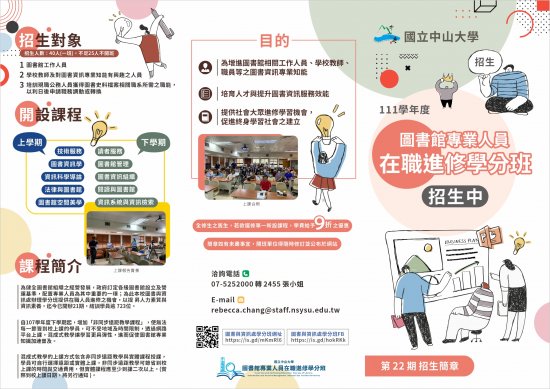 轉知~國立中山大學圖書與資訊處辦理「第22期圖書館專業人員在職進修學分班」下學期招生簡章,鼓勵參加。