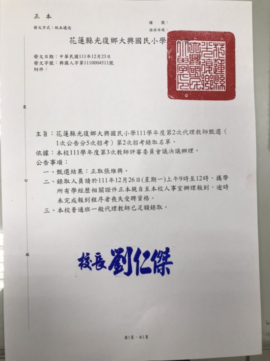 依據本校111學年度第3次教師評審委員會議決議辦理。 一、甄選結果:正取張維興。 二、錄取人員請於111年12月26日(星期一)上午9時至12時,攜帶所有學經歷相關證件正本親自至本校人事室辦理報到,逾時未完成報到程序者喪失受聘資格。 三、本校普通班一般代理教師已足額錄取。