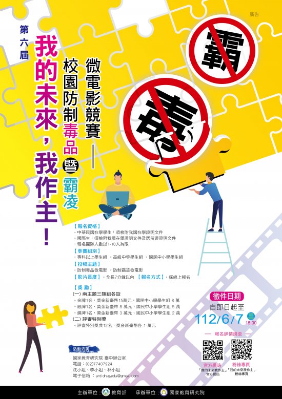 一、教育部第六屆「我的未來我做主」校園防制毒品暨霸凌微電影競賽活動徵件須知及宣傳海報各1份(如附件),歡迎學生踴躍報名。