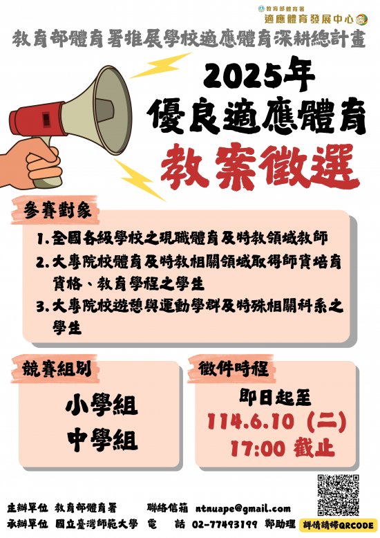 2. 為鼓勵特殊教育與運動教育人員研發適應體育教材,將融合概念及身體素養融入各項體育教學活動中,幫助身心障礙學生與一般學生在運動中一起學習與成長,特委請國立臺灣師範大學辦理旨揭活動。
